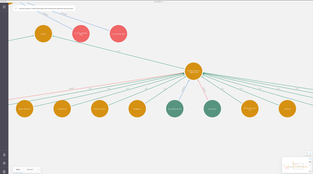 The Vehicle Digital Twin model breaks down into vehicle functions such as Acceleration, Object Detection and Navigation. A domain predicate – Has Failed Service – links to known vulnerability or service history and a range predicate – Has Policy – that refers to Vehicle policy controls such as Security that would detail rules or thresholds.